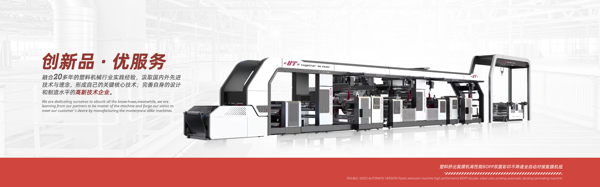優(yōu)特機(jī)械精心致力于塑料編織行業(yè)、紙塑軟包裝行業(yè)、輪胎制造行業(yè)等成套生產(chǎn)設(shè)備的設(shè)計(jì)和制造,并為用戶提供生產(chǎn)工藝及培訓(xùn)。我們的服務(wù)范圍包括各類塑料覆膜機(jī)、紙張覆膜機(jī)、BOPP彩印膜雙面自動(dòng)對(duì)版覆膜機(jī)、 紙塑邊縫三合一覆膜機(jī)、中縫印刷制袋機(jī)、以及輪胎行業(yè)循環(huán)回收使用的隔離膜生產(chǎn)線。